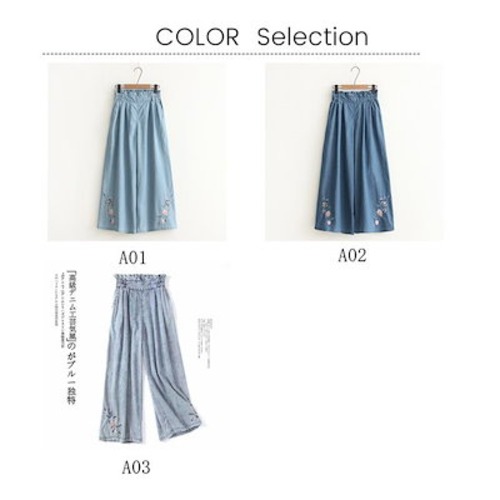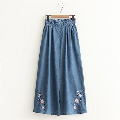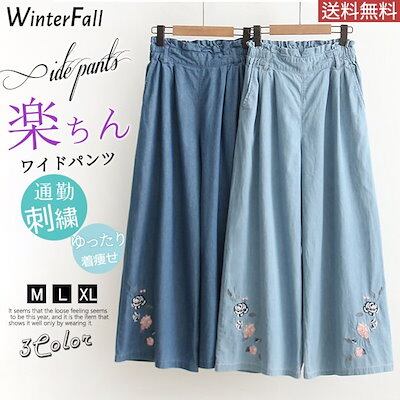 送料無料!ワイドパンツ レディース オシャレ 着痩せ 体型カーバ ウエストゴム タックパンツ デニム 刺繍 ゆったり 美ライン 薄手 通勤通学 楽ちん