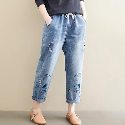 デニムパンツ ウエストゴム 刺繍デニム レディース イージーパンツ 九分丈 ダメージデニム ハイウエ
