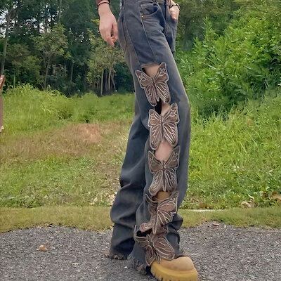 女性用ファッションジーンズレトロスタイルハイウエスト刺繍穴ゆったりとした床丈の蝶中空ワイドレッグパンツ