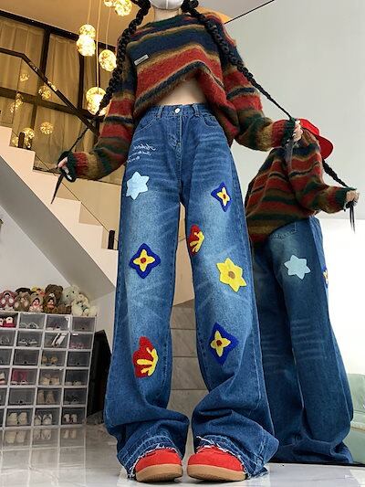 アメリカンレトロレター花びら刺繍ジーンズ女性用ハイウエストスリムストレートワイドレッグフロアモップパンツ