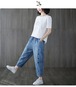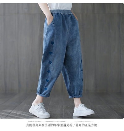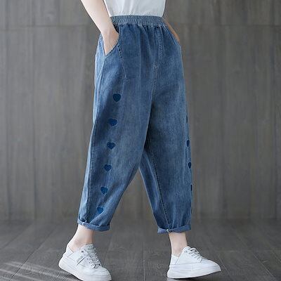 大きいサイズ テーパードパンツ にぴったり薄ジーンズハート刺繍ハーレムパンツウエストゴムパンツ
