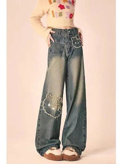 レトロキティ猫刺繍布ワイドレッグジーンズレディース秋の新作国潮学生ストレートパンツ