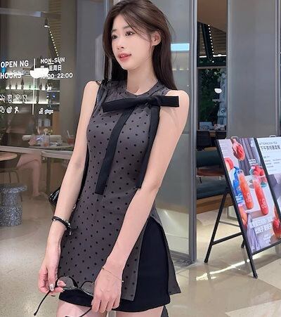 2024 夏 韓国ワンピース ミニ丈 デニム生地 ラウンドネック ノースリーブ リボン プリント Aライン 細見え 夏 ブルー 青 カジュアル おしゃれ かわいい キュート 韓国ファッション レディー