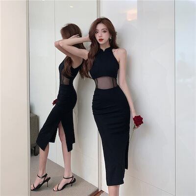 2024夏 韓国スリットメッシュドッキングデザインワンピース韓国
