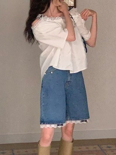 2024 春夏パンツ ハーフパンツ デニム ジーンズ ワイド レース リボン ハイウエスト 美脚効果 脚長効果 細見え 夏 おしゃれ かわいい 韓国ファッション レディース お出かけ