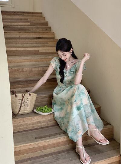 2024夏 韓国ワンピース 半袖 Vネック ミモレ丈 花柄 Aライン ゆったり 細見え 夏 緑 グリーン おしゃれ かわいい 韓国ファッション レディース お出かけ