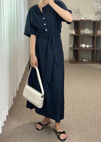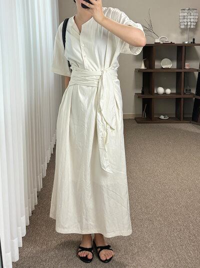 2024 夏 韓国ワンピース ロング丈 ラウンドネック ボタン 半袖 Aライン リボン ベルト ゆったり 細見え 夏 白 きれいめ おしゃれ かわいい キュート 韓国ファッション レディース お出かけ