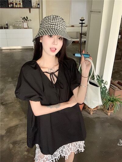 2024 春夏ワンピース 膝丈 レース Vネック 半袖 Aライン ゆったり 細見え 夏 黒 ブラック カジュアル おしゃれ かわいい キュート 韓国ファッション レディース お出かけ