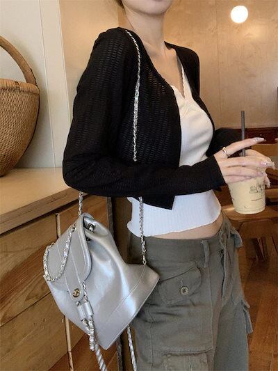2024 夏 韓国 ライトニット カーディガン トップス 羽織り加工 ショート丈 薄手 長袖 紫外線対策 UV対策 きれいめ オフィス OLネックカジュアルフレンチフェミニンファッション韓国レディース