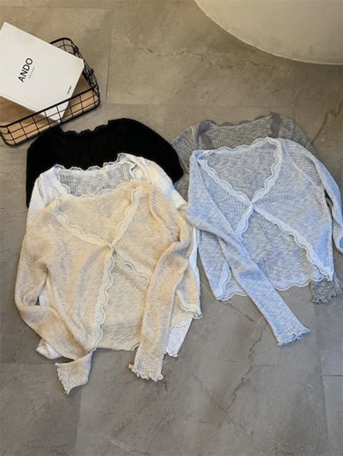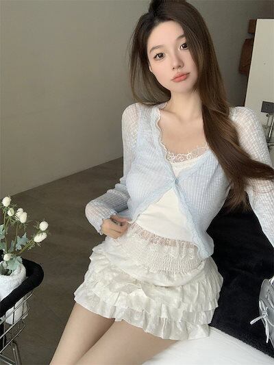 2024 夏 韓国 ショート丈 薄手 カーディガン トップス 長袖 紫外線対策 UV対策 羽織り加工 きれいめ ライトニット オフィス OLネックカジュアルフレンチフェミニンファッション韓国レディース