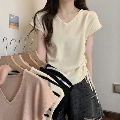 Tシャツ トップス アイスストライプ半袖Vネックプルオーバーチュニック夏の新スタイル レディース 韓国ファッション