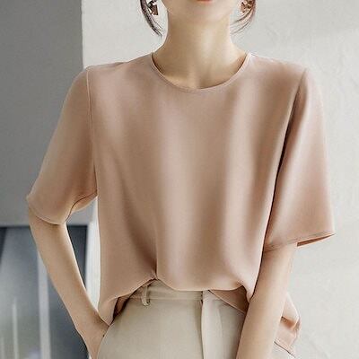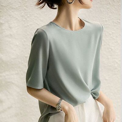 【3日以内出荷】今っぽシアーシャツ 通勤 フレンチムード丸首半袖夏の新作ゆったりサテンシフォントップス レディース 韓国ファッション