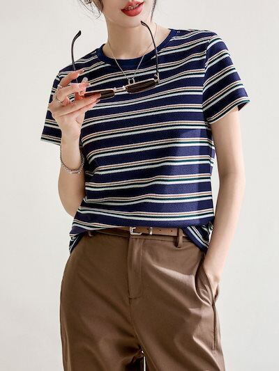 人気 夏 tシャツ 6色 ボーダー柄 シンプル インナー トップス ニット 半袖 レディース 大きいサイズ ロングTシャツカットソー ロンt Tシャツカットソー オフィス スポーツ