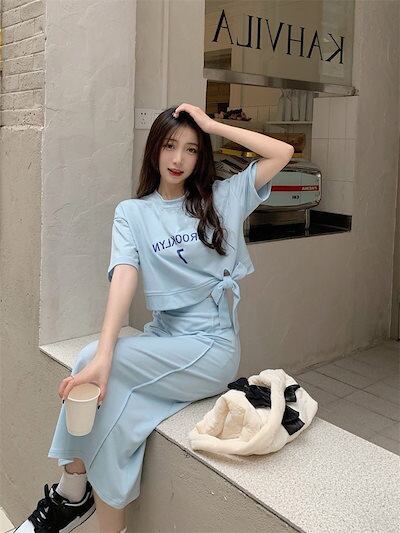 夏 涼しく楽ちんセットアップ 2024 人気 セットアップ レディース カジュアル快適 Tシャツ/スカート上下2点セット 怠惰な風 スウェット 半袖 レディース 部屋着 ジャージルー