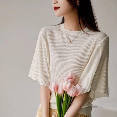 新作 ラッフル シンプル サマーニット 快適 丸ネック ニット トップス アウター サマーニット 韓国ファッション ラウンドネック セーター ベーシックニット人気なリプニット