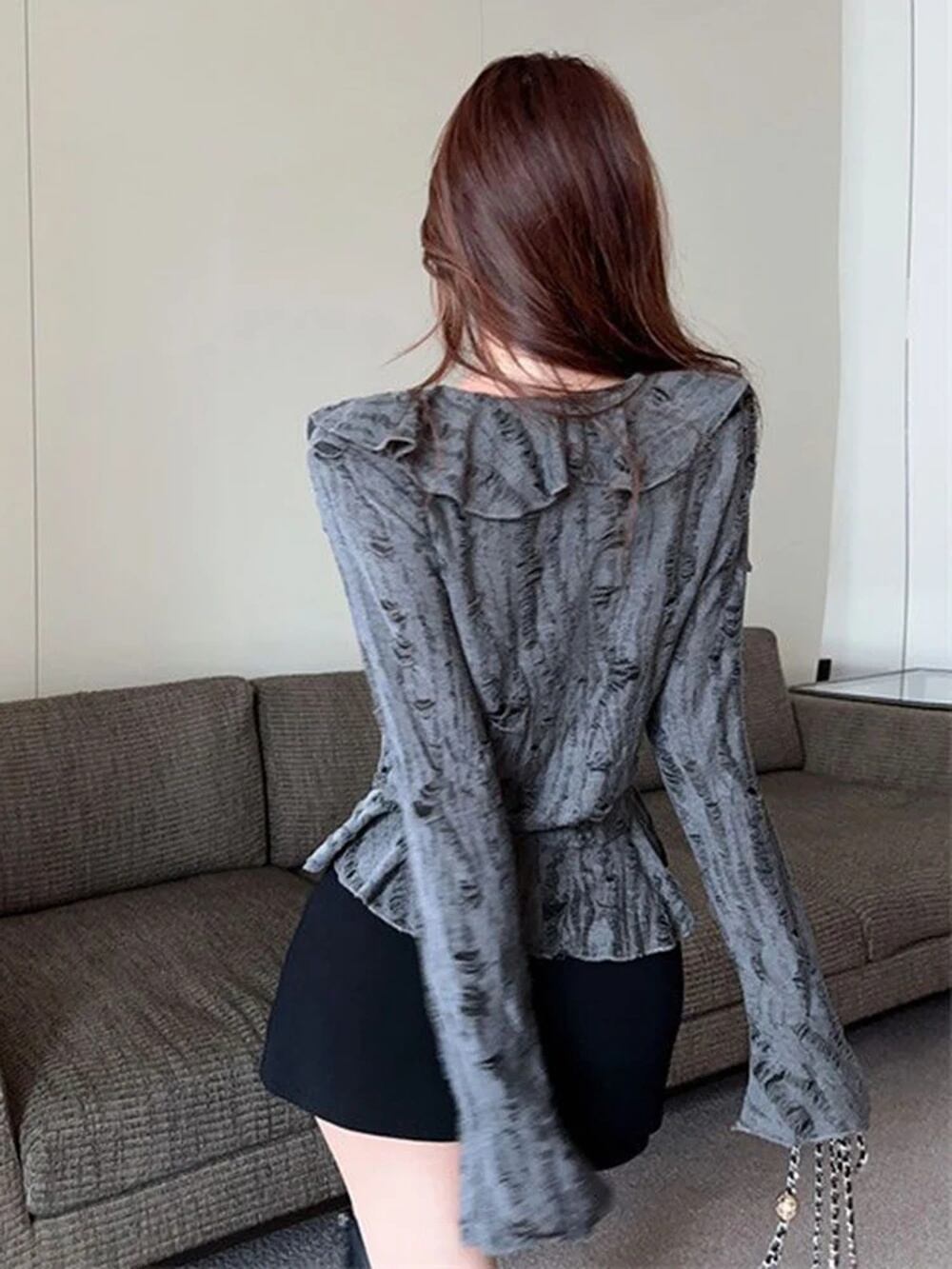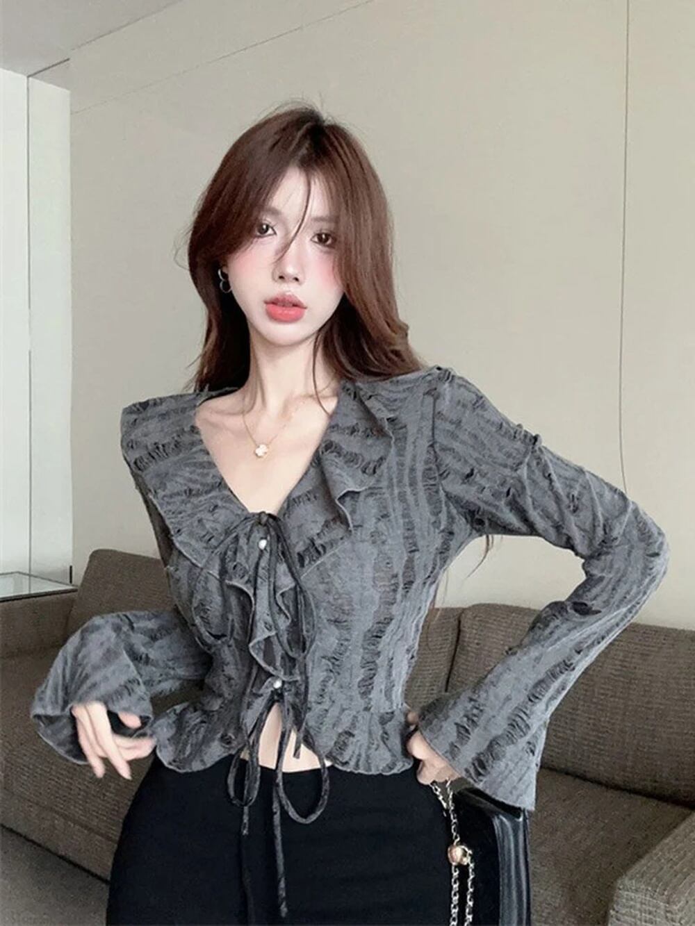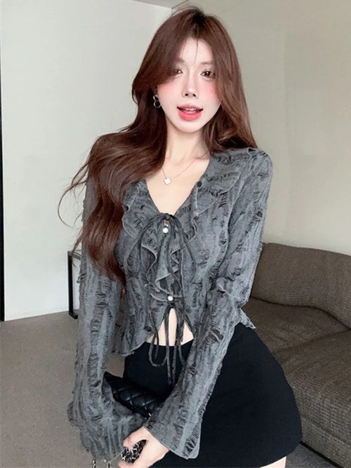 女性用長袖ショートブラウス,原宿ストリートウェア,穴あき,Vネック,スリム,ヴィンテージ,韓国,フリル,y2k,秋 T240926052508_01
