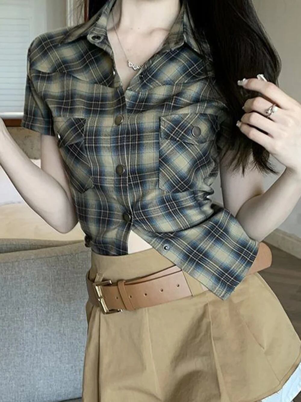 Zoki-女性用ヴィンテージチェックシャツ,カジュアルなハラジュク,半袖ブラウス,韓国風,シングルブレスト T240926055650_01