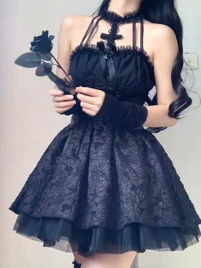 2024 ロリータ ドレス ダークセクシー歌特ブラックウエストワンピースポンポンスカート誕生日ミニスカート花火大会 コスプレ ワンピース ロリータワンピース