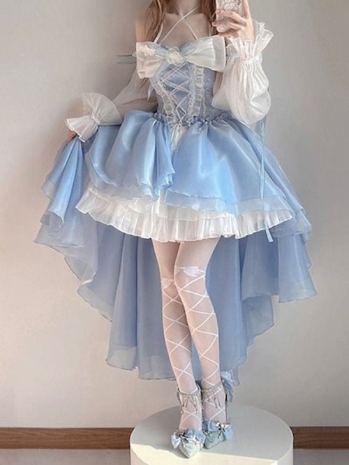 2024 ロリータ ドレス パーティードレス ブルードレス 前短後長 トレーン付き ウェディング風 花嫁ドレス リボントレーン プリンセススカート コスプレ ワンピース ロリータワンピース