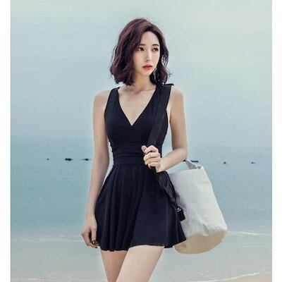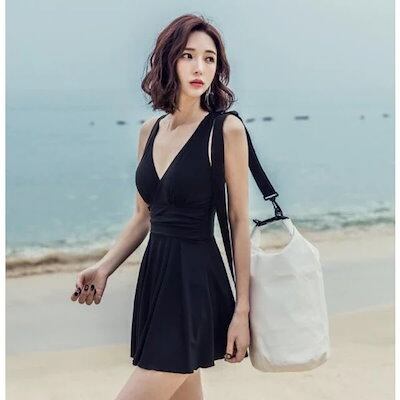 水着レディースワンピース体型カバーママ水着無地Vネックオールインワン大人大きいサイズ女性用可愛い海水