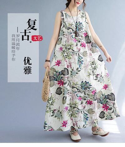 2024/春/夏/レトロ/ファッション/フラワープリント/ノースリーブ/ラウンドネック/コットン/リネン/ワンピース/ゆったり/ロングスカート カップ 付きインナー