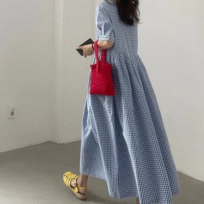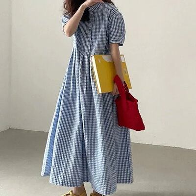 夏/レトロ/気質/ラウンドネック/ボタンの小さな行/ルーズ/カジュアル/チェック柄/膝/ロングドレス/ワンピース カップ 付きインナー