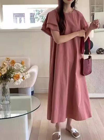 2024/ロング/ヴィンテージ/カジュアル/ラウンドネック/ダブルフリルスリーブ/バックボタン/ゆったり/薄手/夏/ドレス カップ 付きインナー