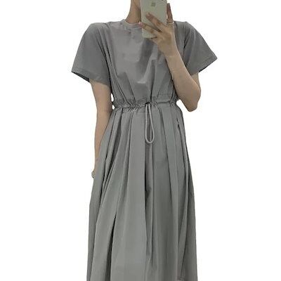 無地 / ドローストリング / ウエストバンド / プレッシャープリーツ / 半袖 / ワンピース / ロングワンピース / レディース カップ 付きインナー