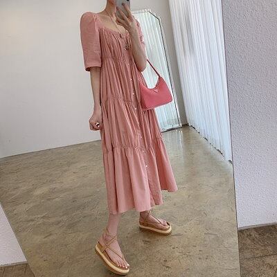夏/新作/ミドル丈/ワンピース/2024/気質/通勤/スクエアネック/プリーツ/ワンピース/女性 カップ 付きインナー