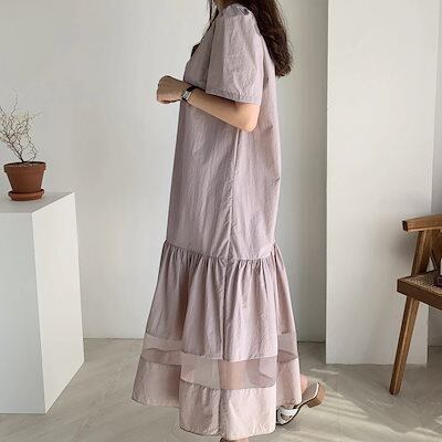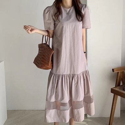 韓国/新作/レース切り替え/ワンピース/2024/夏/女性/ラウンドネック/ウエスト/薄手/ワンピース/女性 カップ 付きインナー