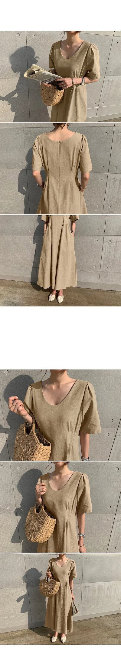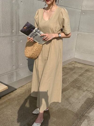 韓国版/無地/Vネック/ウエスト/ロングスカート/半袖ワンピース/2024/春夏/薄手/大きいサイズ/ワンピース/女性 カップ 付きインナー