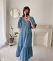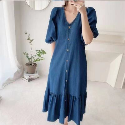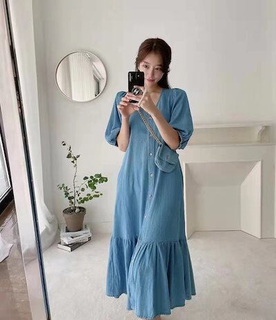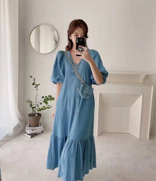 韓国/シック/レトロ/Vネック/細身/シングルブレスト/スリム/ミディアム丈/バブルスリーブ/デニム/フィッシュテールワンピース カップ 付きインナー