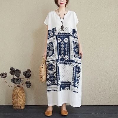 「ファットガール」 夏物/リネン/プリント/大きいサイズ/レディース/Vネック/ロング/ワンピース 日焼け止め ドレス メガ割