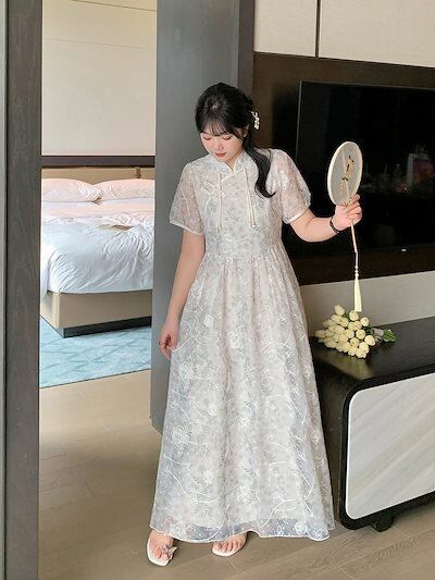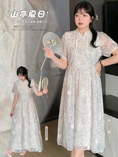 【ぽちゃまに】 夏 長/短2タイプ 中華風 柄ワンピース 大きいサイズ チャイナドレス 体型カバー レトロ レディース ロングワンピース メガ割