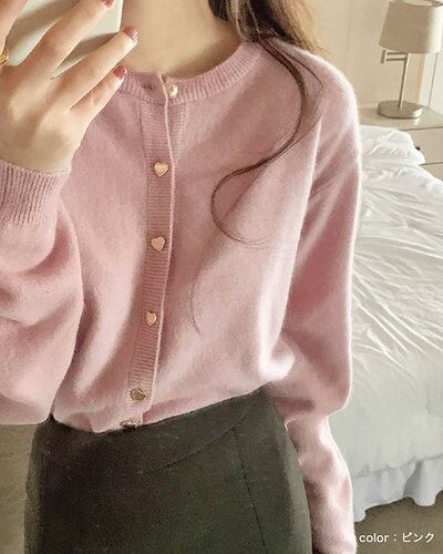 ハートボタン ふわふわ ニット カーディガン 長袖 丸首 レディース 秋 冬 おしゃれ 流行 可愛い きれいめ 上品 カジュアル 無地 プチプラ 韓国ファッション