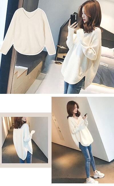 ラウンドヘム Vネック ニット トップス 長袖 セーター ざっくり レディース 裾ラウンド カジュアル きれいめ 長め丈 体型カバー チュニック 無地
