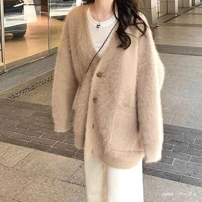 ふわふわ ニット Vネック カーディガン モヘア 長袖 レディース 秋 冬 ロング もこもこ 羽織り おしゃれ 流行 可愛い きれいめ 上品 プチプラ 韓国ファッション
