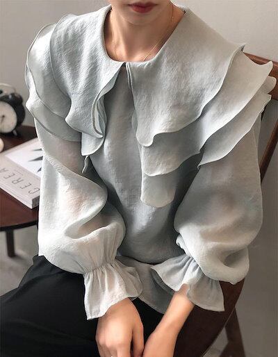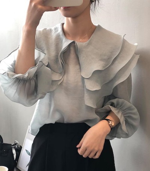 ブラウス フリルブラウス ボリューム袖 トップス シャツ レディース シアー 長袖 ケープ襟 キャンディスリーブ オフィス カジュアル 無地 春夏 フリル 透け感 シースルー ケープカラー ママコーデ