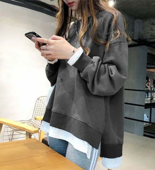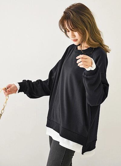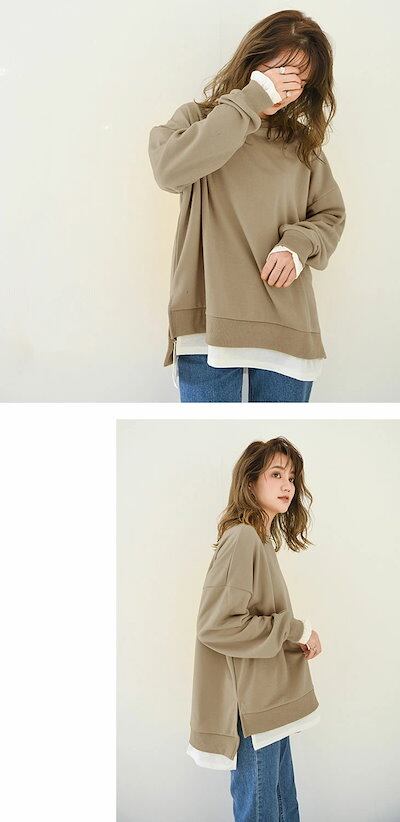 トレーナー レディース スウェット 無地 韓国重ね着風 無地 カジュアル 綿 長袖 トップス カットソー ゆったり ゆるシルエット スウェット おしゃれ 可愛い ブラック