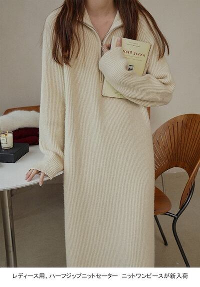 ニットワンピース レディース ロングワンピース 無地 立ち襟 長袖 リブ ハーフジップ トップス