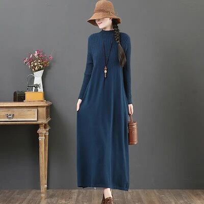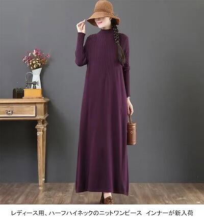 ニットワンピース レディース ニットセーター 無地 ハーフハイネック 長袖 ロング丈 リブ編み
