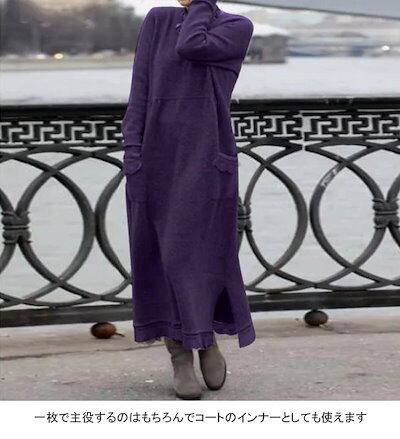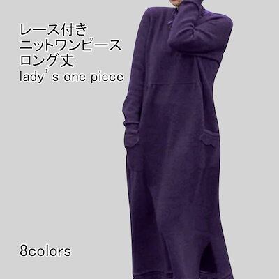 ニットワンピース レディース ニットセーター 無地 クルーネック 長袖 ロング丈 レース付き トップス