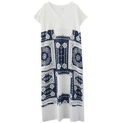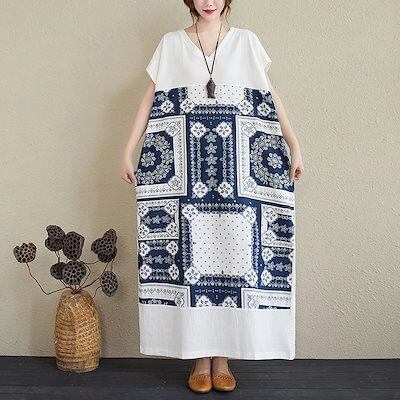 「ファットガール」 夏物/リネン/プリント/大きいサイズ/レディース/Vネック/ロング/ワンピース 日焼け止め ドレス メガ割