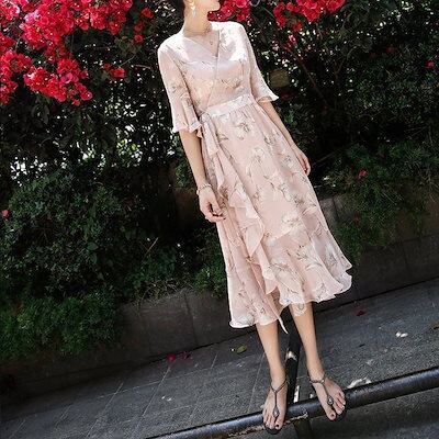 「ファットガール」 春夏 柄ワンピース シフォン 「S-5XL」ロングワンピース 大きいサイズ 体型カバー ボヘミア 着痩せ レディースワンピース メガ割