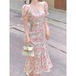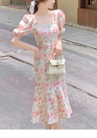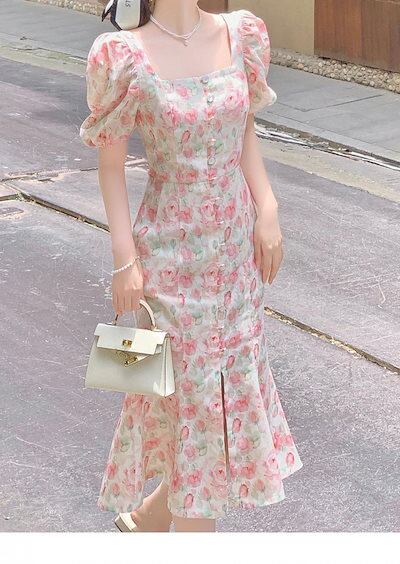 【お勧め商品】 ピンク花柄ワンピース 半袖 スリット フリル スクエア襟 ロングワンピース 夏 着痩せ レディース ワンピース 「W.D」 メガ割