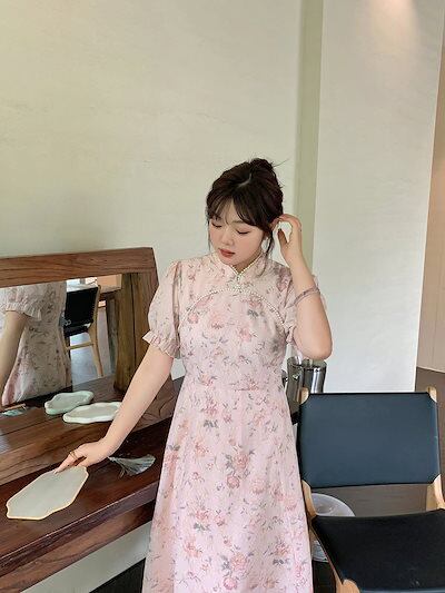 【ぽちゃまに】 夏 中華風 ワンピース 大きいサイズ レトロ レース 体型カバー 長/短2タイプ チャイナドレス 柄ワンピース メガ割
