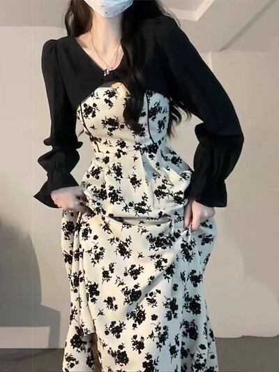 キャミワンピース2024新作小さな花ワンピースロングスカートセットアップキャミソールワンピースフランスロングスカート二点セット