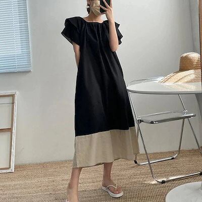 ヘビロテ! キャミワンピ 夏 ワンピース 韓国ファッション Tシャツ レディース 凉感 ラウンドネック 切り替え ゆったり 着やせ ワンピース ラッフル 袖子