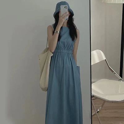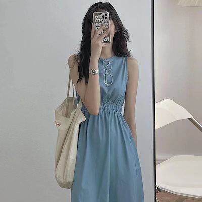 ヘビロテ! キャミワンピ 夏 ノースリーブ ワンピース ゆったり プリーツ 伸縮性のあるウエスト 気質 通勤 ポケット お肌に優しい ラウンドネック 着やせ カジュアル