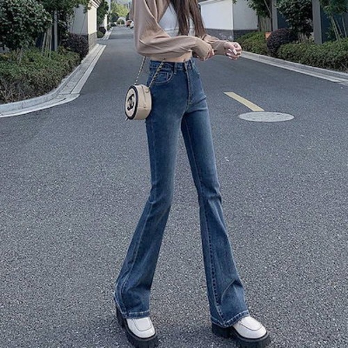 デニムパンツ ハイウエストストレッチマイクロフレアジーンズ女性春秋スリム薄いドレープドラッグストレート馬蹄パンツ